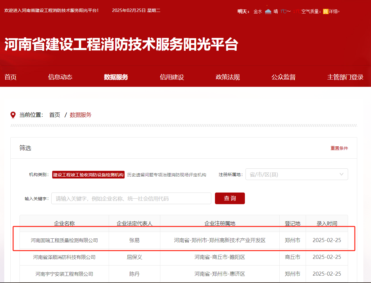熱烈祝賀河南固瑞工程質量檢測有限公司入冊河南省建設工程消防技術服務陽光平臺?。?!